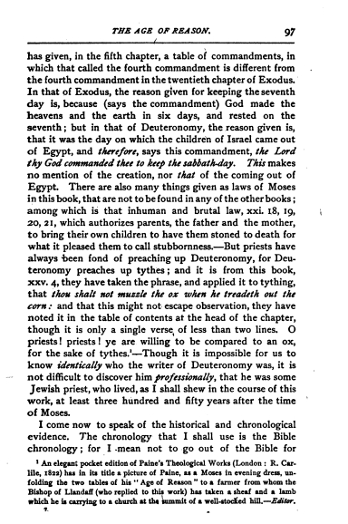 Nie istnieje autorytet na wsparcie wiary iż nieludzkie i makabryczne rzezie na mężczyznach, kobietach oraz dzieciach, o jakich te księgi opowiadają, zostały dokonane, jak te księgi twierdzą, na rozkaz samego Boga. Jest to nieustający każdego prawdziwego deisty obowiązek, windykować Boga sprawiedliwość moralną wobec oszczerstw Biblii.